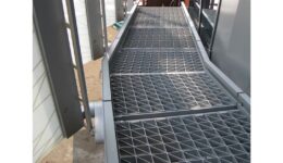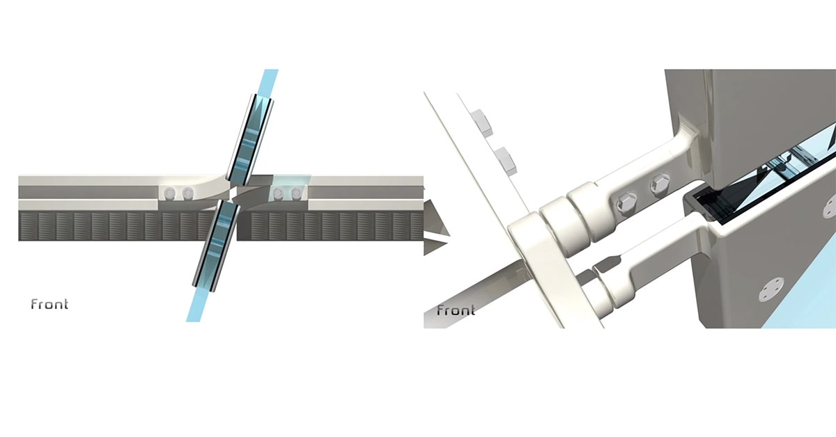 In addition to protecting the curtain wall from sunlight, the horizontal shade structures also support the outer fins and serve as catwalks for maintenance workers. The catwalks are equipped with monorails for technician safety lines and for the transport of replacement glazing panels. In this way the catwalk system reduces the time and cost required for routine cleaning and maintenance, while improving safety for workers.