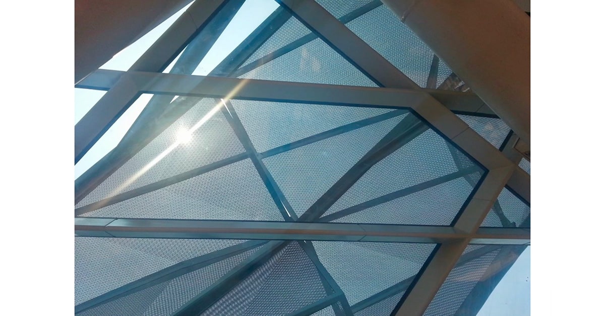 The three-level podium structure at the base of the tower is similarly wrapped in a triple-glazed envelope system. Instead of angled fins and catwalks, however, the podium’s curtain wall system comprises a glass-enclosed diagrid structure enveloped in a secondary “shroud” of perforated aluminum shading armor. The shroud is composed of double-layer “kite” monocoque units that filter sunlight to the grand, airy interior spaces. The overhead glass diagrid panels are further protected by aerogel fill that reflects much of the sun’s light and heat, allowing attenuated daylight to enter the building.