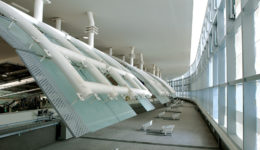 These systems have been carefully integrated into the building’s design to create the nearly seamless facade. Outside air enters each technical level at one end of the technical floor through a fresh air intake louver; exhaust air exits through an exit louver at the opposite end of the floor. The decision to locate the intake and exit louvers at the narrow, notched ends of the building minimizes their visual impact and facilitates uniformity of appearance of the tower’s primary north and south facades.