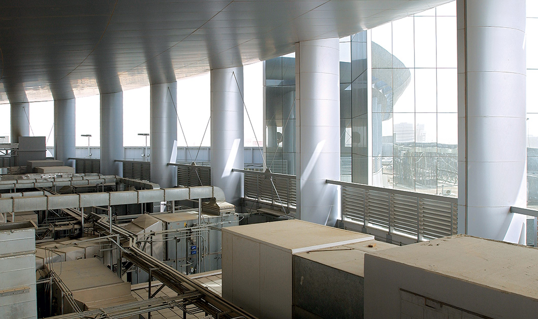 Similarly, a series of different HVAC systems serve various zones of the east and west podium buildings located at the base of the tower, according to the needs of their individual programs. The west podium contains a ballroom, fitness club, and other hotel amenity spaces; VAV units serve the amenity spaces, while constant volume units serve the ballroom and fitness spaces. The three-story Al-Mamlaka shopping mall in the east podium relies upon different types of cooling systems for each of its three types of spaces: factory package air handling units in the circulation space, fan coil units in the retail stores, and custom tenant-provided systems in the anchor stores.