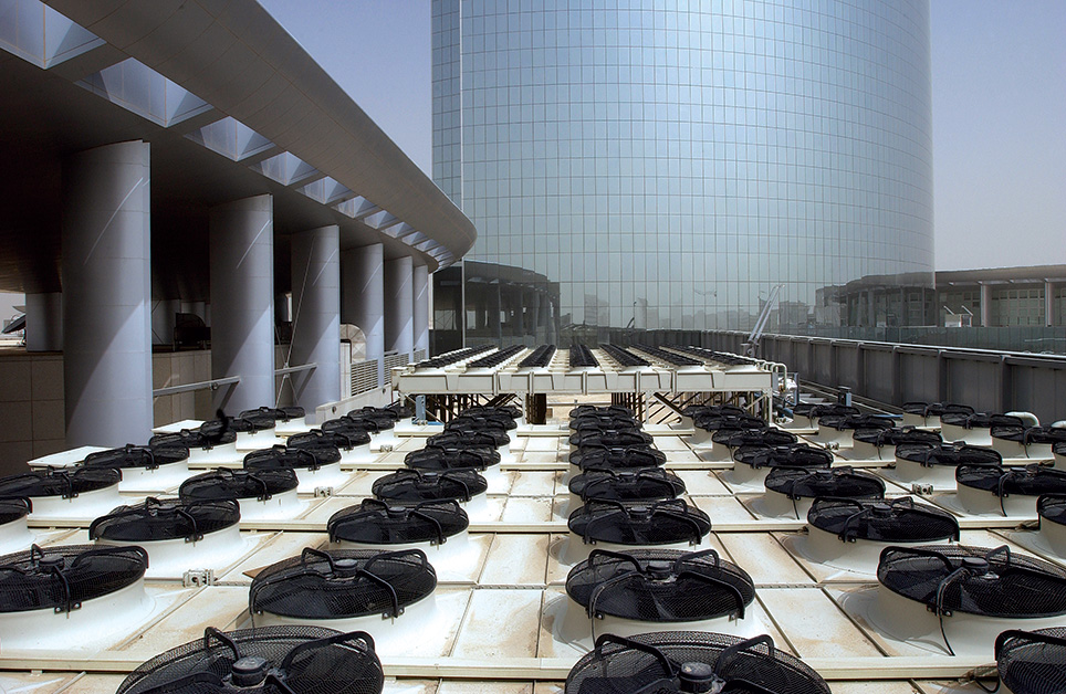 Maintaining a comfortable internal environment can be a challenge in any tall building, and especially for the tallest building in Saudi Arabia, a country known for its harsh desert climate. The Kingdom Centre’s mechanical system had to serve its complex mixed-use program, with many functionally different spaces requiring independent environmental control systems. In addition, it had to meet the restrictions imposed by the Saudi Electricity Company: cooling for the entire building for at least four hours a day had to be accomplished without using vapor compression chilled-water refrigeration machines, which are energy-intensive.