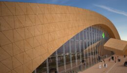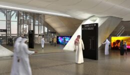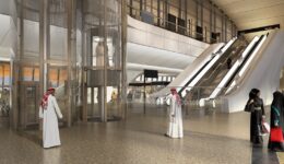 Soft daylight suffuses the station’s interior. The building is equipped with a variety of sun-breaking overhangs, suspended tensile structures, and insulated glass curtain walls that filter the harsh sunlight to control glare and heat gain. This filtered daylight reflects off the tall, gently curved ceilings, which are finished in acoustic materials that match the golden Riyadh limestone used on the station’s exterior.