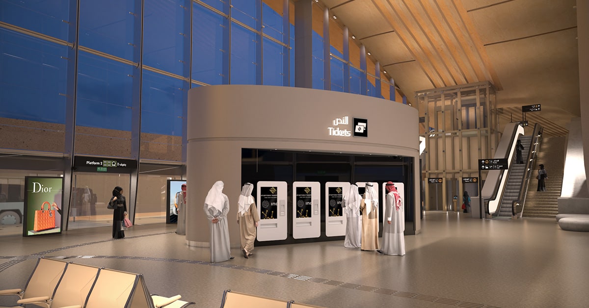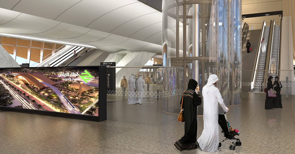 Interior view of the Riyadh Metro Western Station. 3D Render © Omrania. .