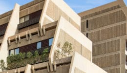 Omrania, GOSI Housing and Commercial Center, Riyadh, 1980-84. The 7-story apartment building steps back like a ziggurat. Photo © Peter Bogaczewicz / Omrania.