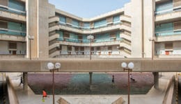 Occupying an entire block along Sitteen Street, one of the most important streets in Riyadh, the Housing and Commercial Center comprises three main components: an inclined, seven-story L-shaped residential structure, two seven-story twin commercial blocks, and a large multi-tiered courtyard criss-crossed with elevated walkways and platforms. Two underground levels accommodate car parking and storage.