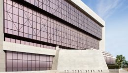 The eight-story office building is composed of glass-enclosed cantilevered volumes set within a granite-clad frame. Although the design is clearly modern, the square plan, central atria, prominent use of stone, and symmetrical facades recall traditional architecture and give the building a distinctively civic presence. Inside, Islamic geometric patterns and motifs recur throughout the 30,000-square-meter building, which houses the Secretary General’s private office, open offices, dining facilities, seminar and conference rooms, and underground parking.