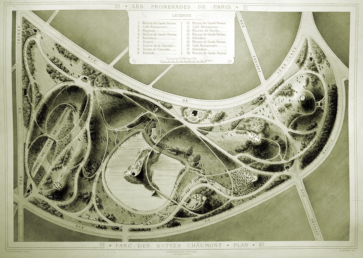 Parc des Buttes-Chaumont, Paris, France – Historic Drawing – Photo © Government of France / Wikimedia Commons
