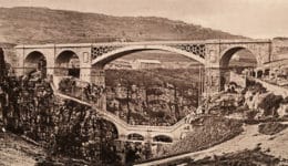Today marks the 105th anniversary of the simultaneous opening of two of Constantine’s most important bridges on April 19, 1912. One, the Sidi M’Cid Bridge, 164 meters long and 175 meters above the gorge, at that time the highest in the world, is a hybrid of a suspension bridge and a cable-stayed bridge, designed by French engineer Ferdinand Arnodin. The other, the Sidi Rached Bridge, is a 447-meter-long masonry viaduct comprising 27 arches, designed by engineer Paul Séjourné with Georges Boisnier, 105 meters above the river. Both are successful, but they are opposite in design character, juxtaposing the lightness of a steel tensile structure with the mass of the stone arches.