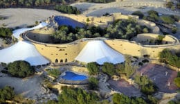 The Heart Tent; a beautiful shading structure in Tuwaiq Palace, 1981–1985, designed in a collaboration between Omrania, Frei Otto, and Buro Happold. The artistic glass tiles of the tent were hand painted by Ms. Bettina Otto. Photo © Peter Bogaczewicz / Omrania