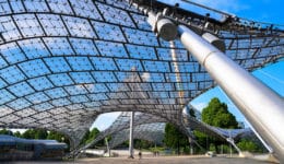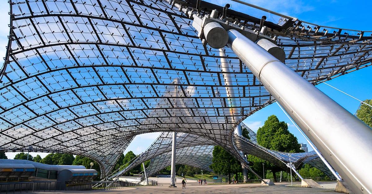 However, it was with his designs for the German Pavilion at EXPO67 in Montreal and the 1972 Olympic Stadium in Munich (designed in collaboration with Günter Behnisch) that Otto became known around the world. The enormous cable-net structure of the Munich Olympic Stadium was meant to show Germany in a new light, specifically rejecting the neoclassical heaviness of the 1936 Berlin Olympic Stadium. The suspended roof floats over the grounds of the Olympic campus, incorporating the natatorium, gymnasium, and main stadium into a single tensile structure.