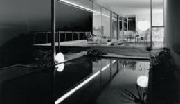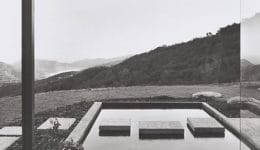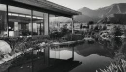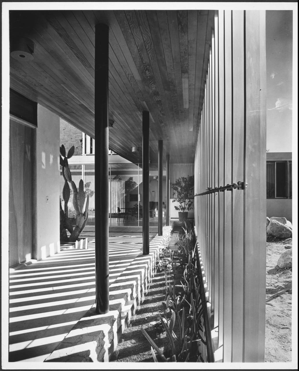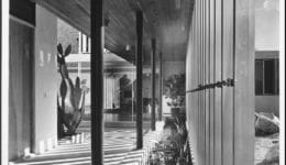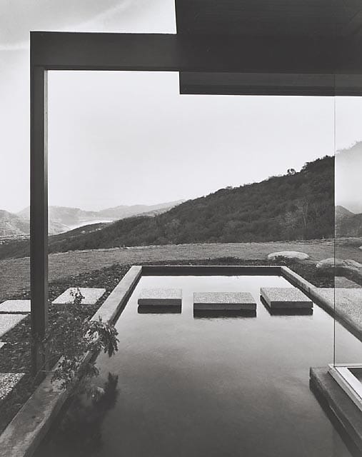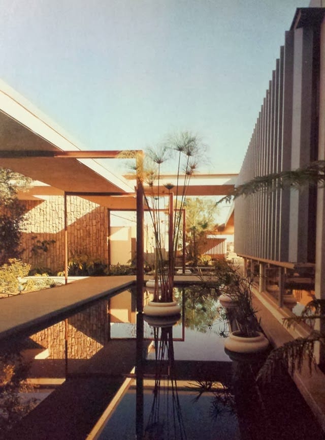 In the Kaufmann House (1946) set in the desert landscape of Palm Springs, California, Neutra created what historian Thomas Hines calls “an obviously man-made pavilion for encountering, inhabiting, and observing the desert,” with radiant heat flooring continuing seamlessly to the outdoor patio for chilly desert evenings, and a shaded rooftop deck screened by louvers. Similarly, the Moore House (1952) in Ojai, California was conceived as an architectural oasis in the arid landscape, with lily ponds to humidify the air and serve as a reservoir for irrigating the gardens. The indoor-outdoor connection was expressed by the continuation of roofing and flooring materials beyond the full-height glass walls, adding movable curtains for privacy.