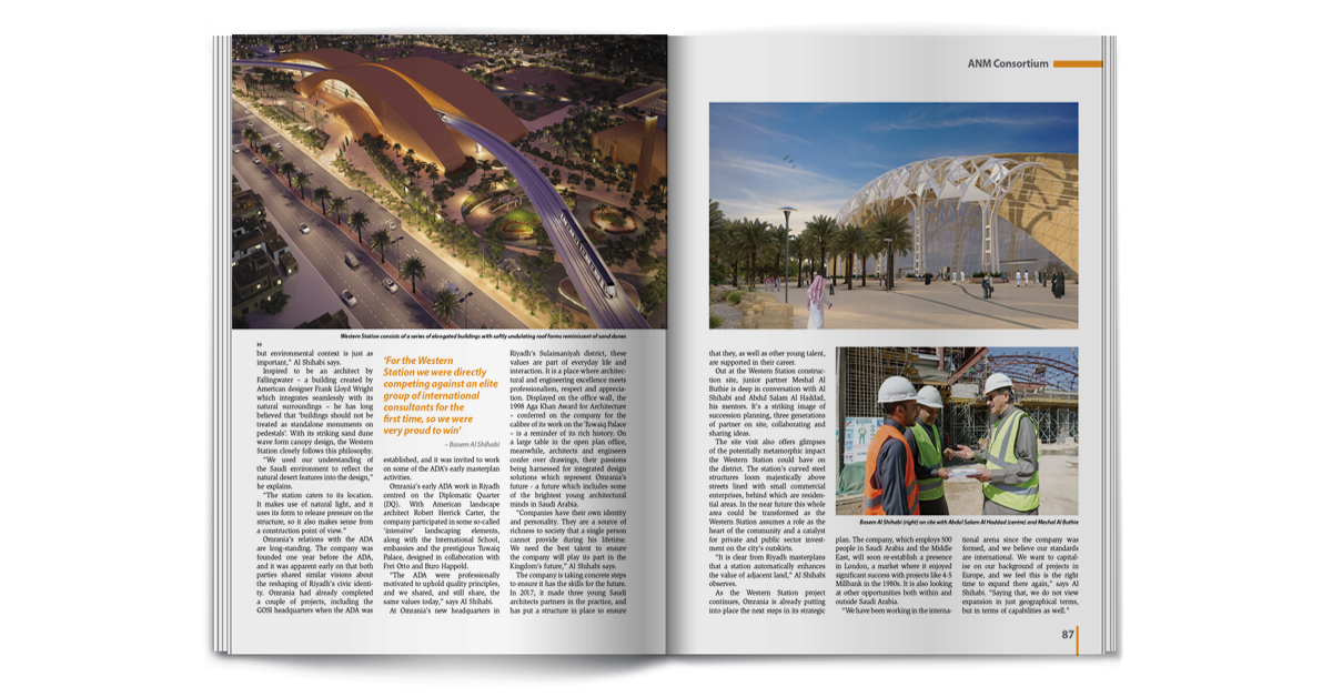 Omrania co-founder and Managing Director Basem Al Shihabi says that when Omrania won the design contract for the hub station in 2011, “We were directly competing against an elite group of international consultants and were very proud to win.” Part of the reason for the company’s success, the article notes, is the fusion of “architectural and engineering excellence” mixed with “keen respect for the environment where the building rests.”