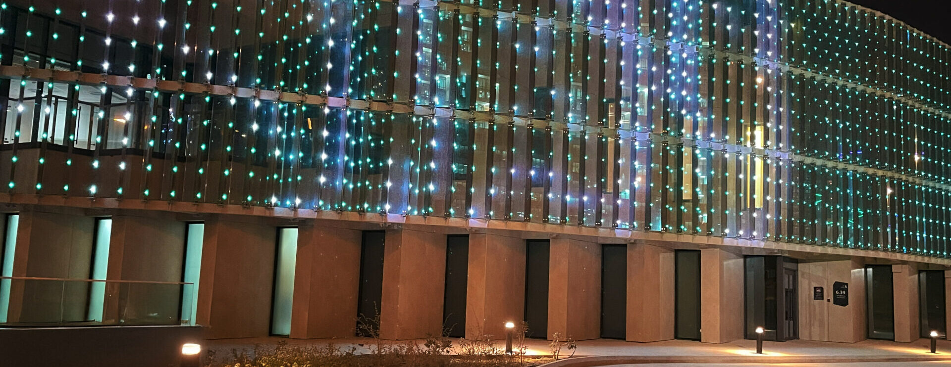 Strategically positioned at a highly visible corner within KAFD, the fire station features a distinctive curved elevation that enhances its architectural identity while integrating seamlessly with the urban fabric. The station’s louvered glass façade, illuminated by matrix LED lighting, creates a dynamic interplay of light and shadow, functioning both as a public artwork and an essential component of the building’s environmental performance. The design prioritizes operational efficiency and sustainability while establishing a strong visual presence within the district.