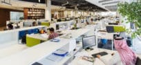 The partially frosted glass walls surround the management offices allowing light to penetrate the entire space while maintaining a sense of privacy.
