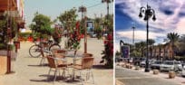 The street now integrates a tree-lined pedestrian promenade with a string of activity nodes providing critical active and passive uses—informal sitting areas, outdoor cafe spaces, strolling, public art work displays…etc. This new open space serves as a public amenity by doubling the community open space while also buffering the cafes and shops from the traffic .