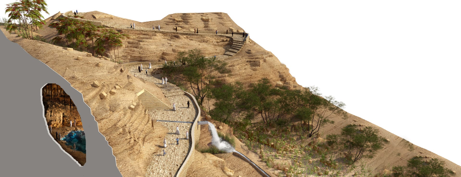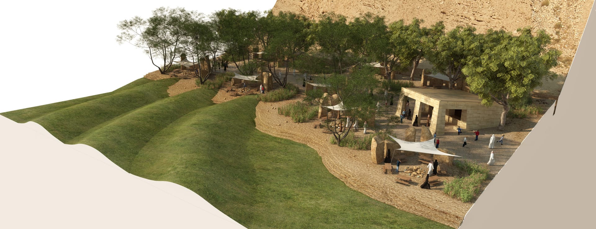 The park also features a Secret Wadi, hidden behind a Palm Grove and containing shaded and cool areas including the Grotto – a series of rooms carved and built into the rock face. In addition, a Mosque, set in its own garden area in a slightly elevated position, provides a place for congregating and views across the park.