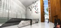 The interior is treated with a minimalist approach, maintaining the formal identity of the institution as well as providing a bold modernist character. The entry to the main atrium is characterized by a sense of exploration, where the rigid rustic external walls unfold to reveal the polished interior finishes. A central naturally lit air conditioned space (atrium) serve as a waiting area for visitors as well as a pre function zone for events. The atrium is injected with a three dimensional visual experience; looking out to green pockets on multiple levels as well as glimpses of the functions wrapping around it.