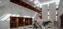 The existing municipal setbacks which establish the building edges were re-interpreted. These edges were designed as free standing screens set apart from the actual building envelope of the embassy. The result is a habitable layered wall, both reinforcing the embassy’s security and creating interesting in-between spaces of shaded gardens and intermittent framed views of Amman. From the outside, this continuous protective marble screen endows the embassy with a grand monumental image, which establishes it as one of Amman’s major landmarks.