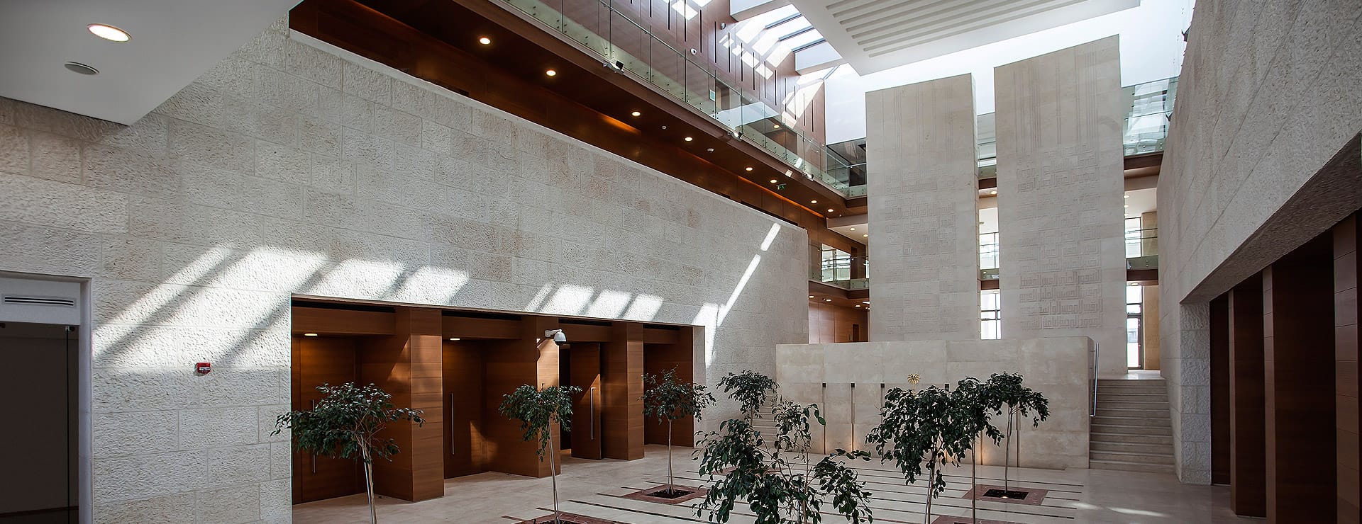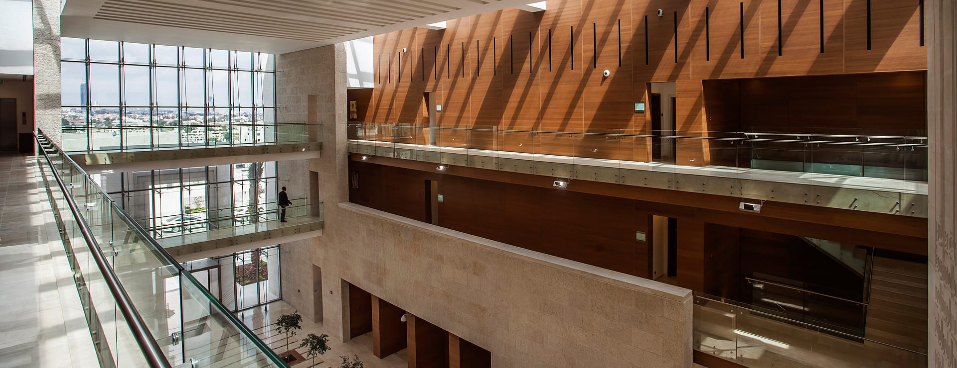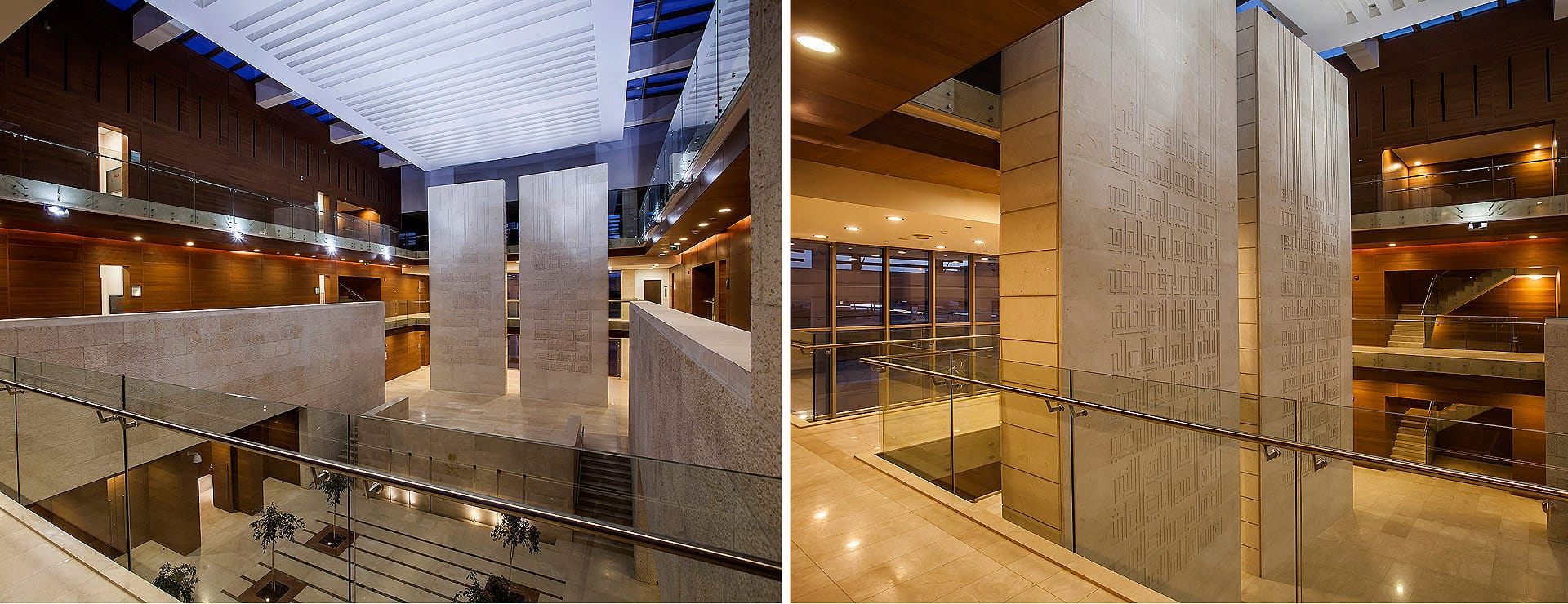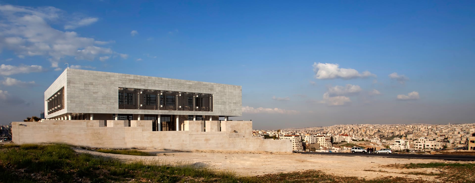 Resting on a terraced stone platforms, the embassy’s monolithic building surmounts the summit as an “acropolis” that overlooks Amman’s mountains and endows a grand monumental image, which establishes it as one of Amman’s major landmarks.
